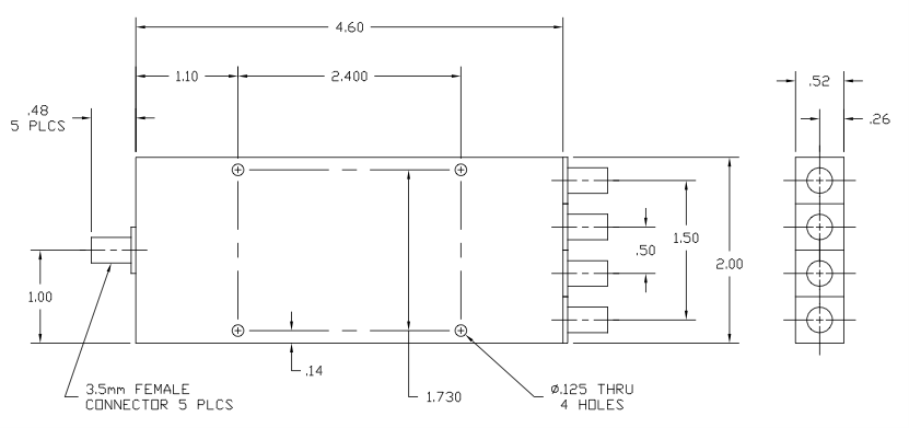 The 4-way power divider is a compact package measuring just 4.60 inches (L) x 2.00 inches (W) x 0.52 inches (H), weighs only 8-ounces, and comes with standard 3.5-mm coaxial Female connectors.