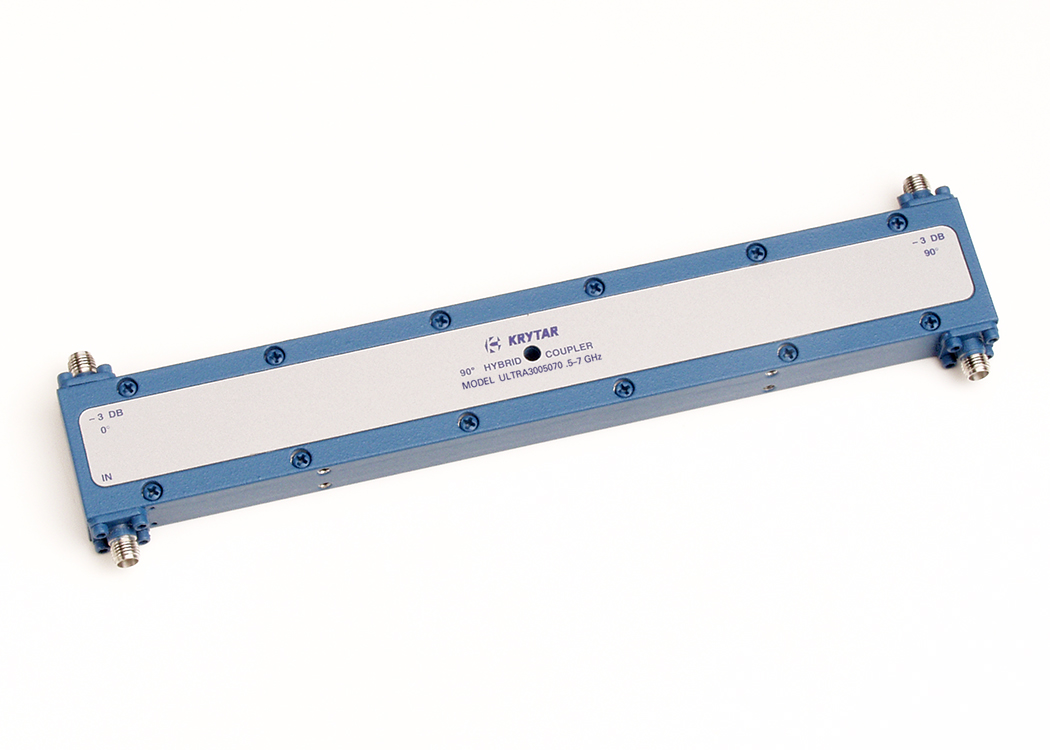 KRYTAR’s new hybrid coupler, Model ULTRA3005070, delivers exceptional versatility from 0.5 to 7.0 GHz (UHF thru C-Bands) with excellent phase and amplitude matching. Typical specifications include 3 dB Coupling; Amplitude Imbalance: ±0.38 dB; Phase Imbalance is ±3 degrees; Isolation is >20 dB; Maximum VSWR: 1.3; and Insertion Loss of <1.2 dB.