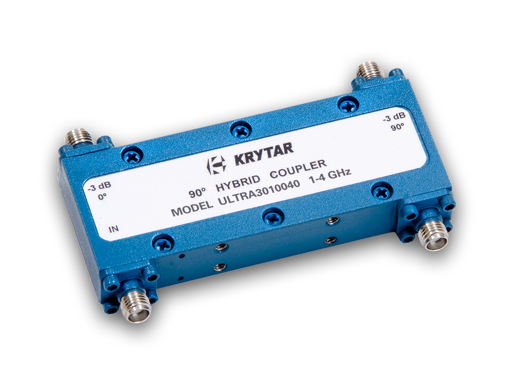 KRYTAR’s new hybrid coupler, Model ULTRA3010040, delivers exceptional versatility from 1.0 to 4.0 GHz (L- thru S-Bands) with excellent phase and amplitude matching. Typical specifications include 3 dB Coupling; Amplitude Imbalance: ±0.5 dB; Phase Imbalance is ±4 degrees; Isolation is >20 dB; Maximum VSWR: 1.25; and Insertion Loss of <0.9 dB.